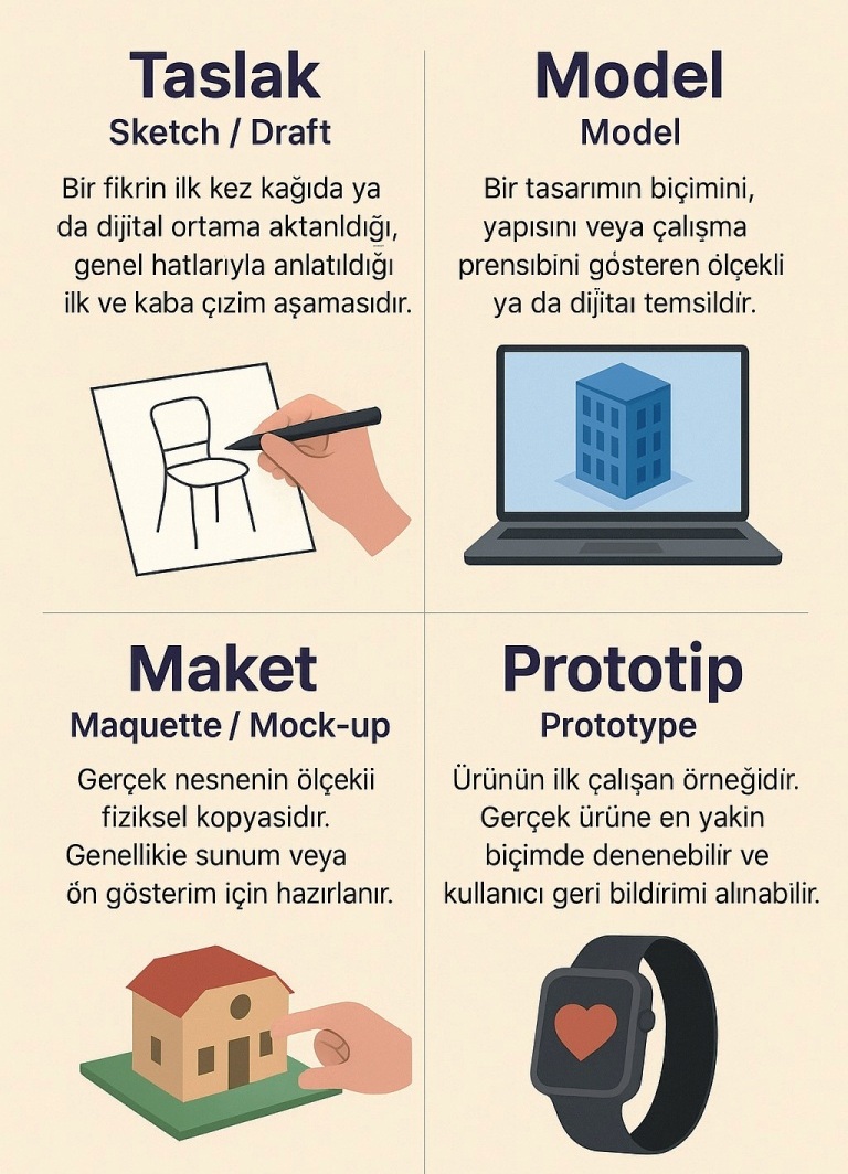 “Taslak”, “model”, “maket” ve “prototip” kavramları genellikle tasarım