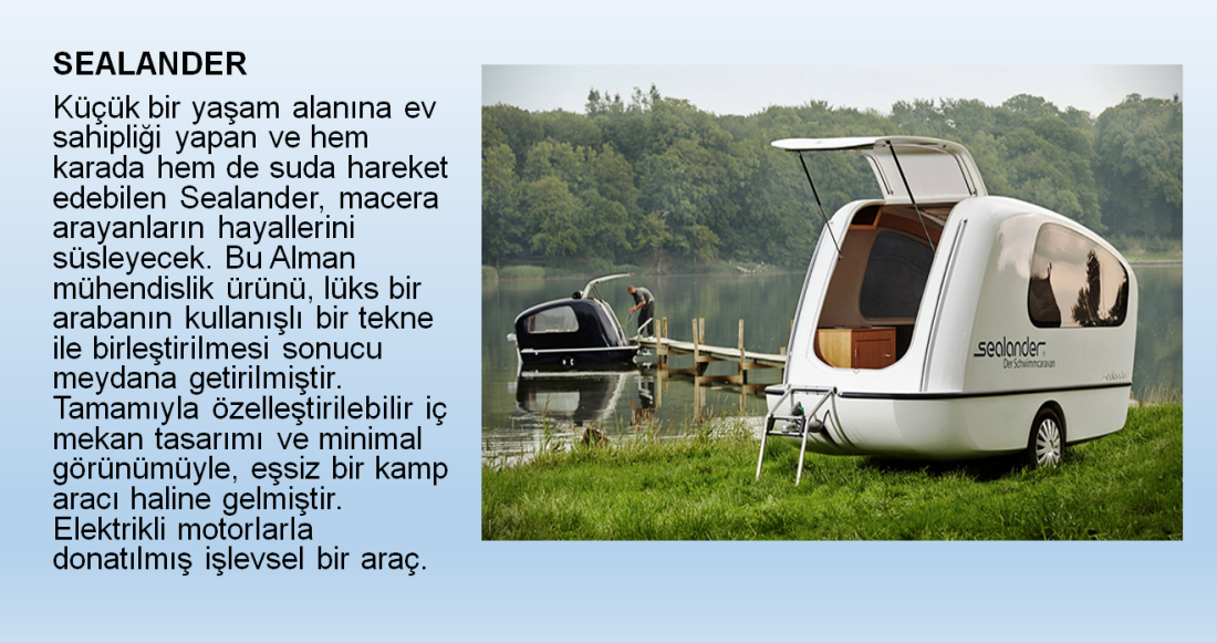 Geleceğin ulaşım araçlarının nasıl olacağı hepimizi meraklandırmaktadır. Geleceğin ulaşım araçları yenilenebilir enerji sistemlerini kullanacak, farklı hibrid enerji sistemlerine sahip olacaktır. Daha fazla işleve sahip olup karada,havada, denizde vb. bir çok alanda etkin olacaktır.